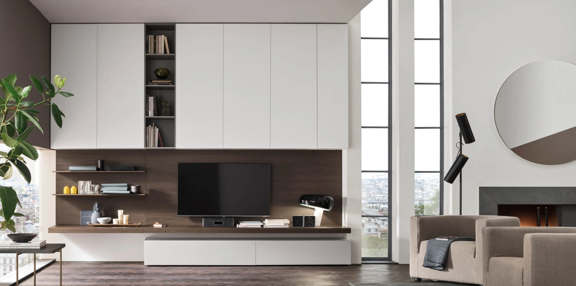 Attraverso un gioco dinamico di accostamenti fra componenti a giorno o vani chiusi, le Pareti Attrezzate moderne arredano il living sfruttando bene ogni spazio. Questa parete attrezzata è una delle soluzioni della marca e ti consentirà di allestire il living secondo le più personali esigenze abitative. Le Pareti Attrezzate hanno conquistato un posto fondamentale nella zona giorno delle nostre case: sono arredi multifunzionali e salvaspazio sempre realizzabili su misura per te.